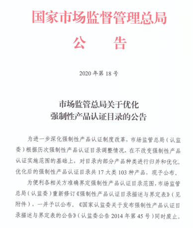 2020年修訂版CCC認證產(chǎn)品目錄描述與界定表發(fā)布公告(2020年第18號)