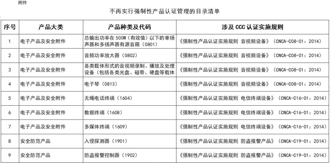 一、對安全風(fēng)險較低、技術(shù)較為成熟的9種電子電器產(chǎn)品不再實(shí)行CCC認(rèn)證管理(見附件)。