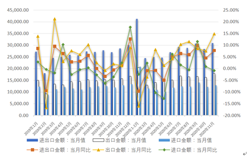 2020年,隨著數(shù)字技術的深入發(fā)展,跨境電商、市場采購貿易、外貿綜合服務等外貿新業(yè)態(tài)進出口比重明顯上升。全年跨境電商進出口1.69萬億元,增長31.1%,市場采購出口增長25.2%。中歐班列全年開行1.24萬列,發(fā)送113.5萬標準箱,分別增長了50%和56%。高水平開放平臺帶動作用明顯。全年綜合保稅區(qū)進出口增長17.4%,自由貿易試驗區(qū)進出口增長10.7%,海南自由貿易港免稅品進口增長80.5%。