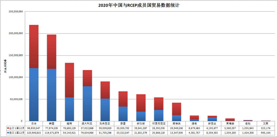 2020年, RCEP成員國中的東盟10國已超越歐盟成為我國第一大貿(mào)易伙伴,進(jìn)出口值4.74萬億元人民幣,增長7%。其中,單對(duì)越南的進(jìn)出口高達(dá)1.33萬億人民幣, 增長18.8%;日本、韓國分別為我國第四和第五大貿(mào)易伙伴,進(jìn)出口值分別為2.2萬億元人民幣、1.97萬億元人民幣,分別增長1.2%和0.7%; 對(duì)澳大利亞進(jìn)出口1.17萬億元人民幣,下降0.1%;對(duì)新西蘭進(jìn)出口0.13萬億元人民幣,下降0.4%。
