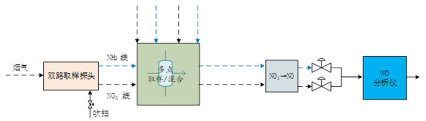 在煙道截面上選取多個(gè)測點(diǎn)(標(biāo)準(zhǔn)配置為每側(cè)煙道3點(diǎn)),設(shè)計(jì)內(nèi)嵌式催化劑雙通道樣氣取樣裝置,一路(NOX線)直接抽取煙氣,另一路(NH3線)抽取煙氣的同時(shí)在催化劑的作用下進(jìn)行還原反應(yīng),兩路煙氣分別進(jìn)行冷凝、除水、干燥等預(yù)處理。多個(gè)測點(diǎn)的NOX線、NH3線分別進(jìn)行混合,從而匯集為兩路樣氣進(jìn)入NO分析儀測量,其測量數(shù)據(jù)的差值即為氨逃逸數(shù)值。