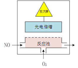 基于一氧化氮(NO)與臭氧(O3)的化學(xué)發(fā)光反應(yīng)產(chǎn)生激發(fā)態(tài)的NO2分子,當(dāng)激發(fā)態(tài)的NO2分子返回基態(tài)時(shí)發(fā)出一定能量的光, 所發(fā)出光的強(qiáng)度與NO的濃度呈線性關(guān)系,利用檢測光強(qiáng)來進(jìn)行NO的檢測, 其化學(xué)反應(yīng)式如下: