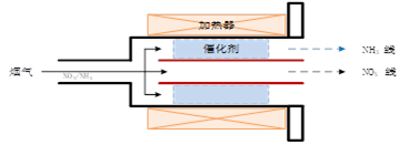 在煙道內(nèi)直接將煙氣中的NH3與NO按照1:1比例進(jìn)行高效催化反應(yīng),通過測量原煙氣及其與催化反應(yīng)后煙氣內(nèi)NO的變化獲取原煙氣中NO和NH3的含量,分析儀采用高精度NO分析儀。
