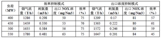 以某廠600MW亞臨界、汽包爐脫硝系統(tǒng)為對象,采用效率控制模式及出口濃度控制模式運行數(shù)據(jù)如下表: