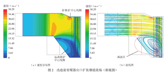 圖2 改造前省煤器出口擴(kuò)張煙道流場(俯視圖)